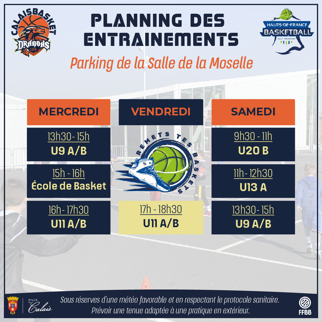 - Les séances se feront soit sur le parking de la Salle de la Moselle, soit sur le terrain rue Mollien ou sur les terrains de Coubertin de manière sécurisée et dans le respect des mesures sanitaires.